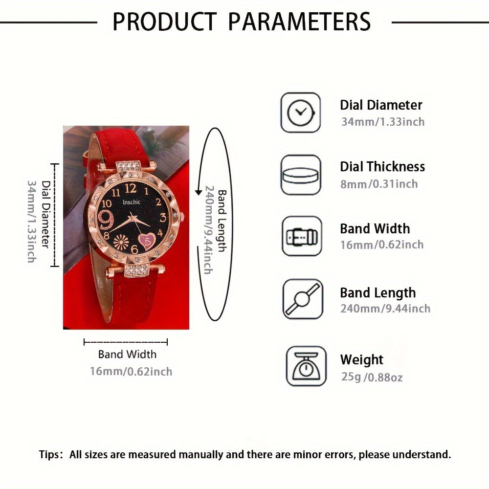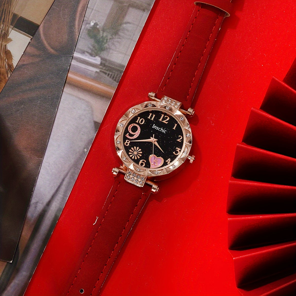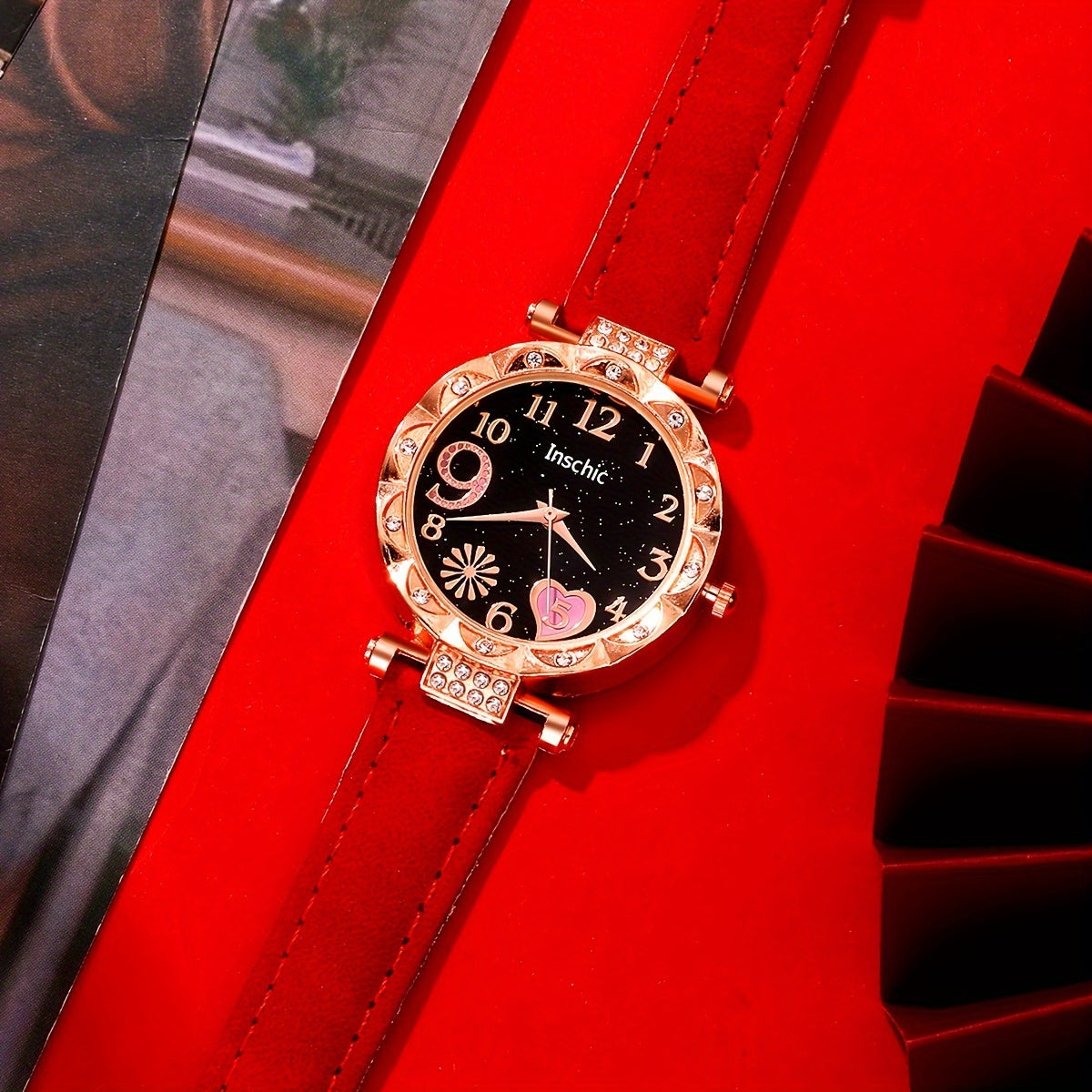 6pcs/set Women's Elegant Heart Rhinestone Quartz Watch Analog PU Leather Wrist Watch & Bracelets, Valentines Gift For Her